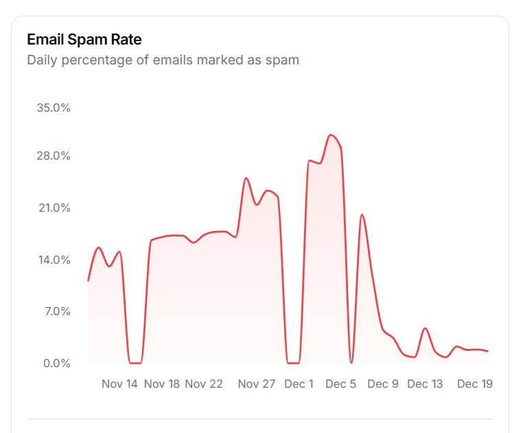 In late November 2025, right as the Q4 deal-closing window opened, their domain reputation collapsed. The spam rate skyrocketed to ~30%. They were losing 1 in 3 critical conversations.